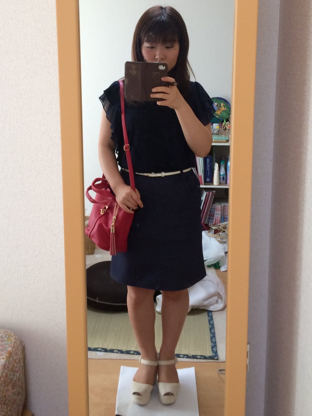 ネイビーでまとめてみました! トップスは肩フリルのプルオーバーです! 白のベルトでウエストマークして、差し色に赤のバッグを持ったのがポイントです♬