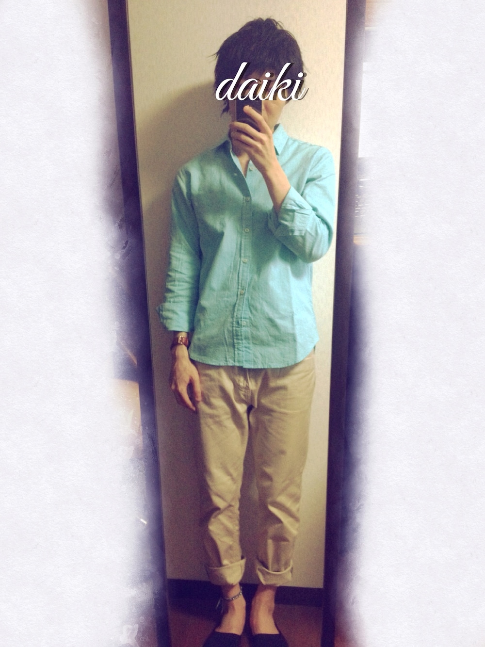 ブルーのシャツとベージュのパンツを合わせて、 淡目のトーンでまとめてみました。 よく見えないけど、アンクレットも ブルー系で統一しています(笑) [item] ・シャツ:NO BRAND ・パンツ:BEAMS ・アンクレット:wakami