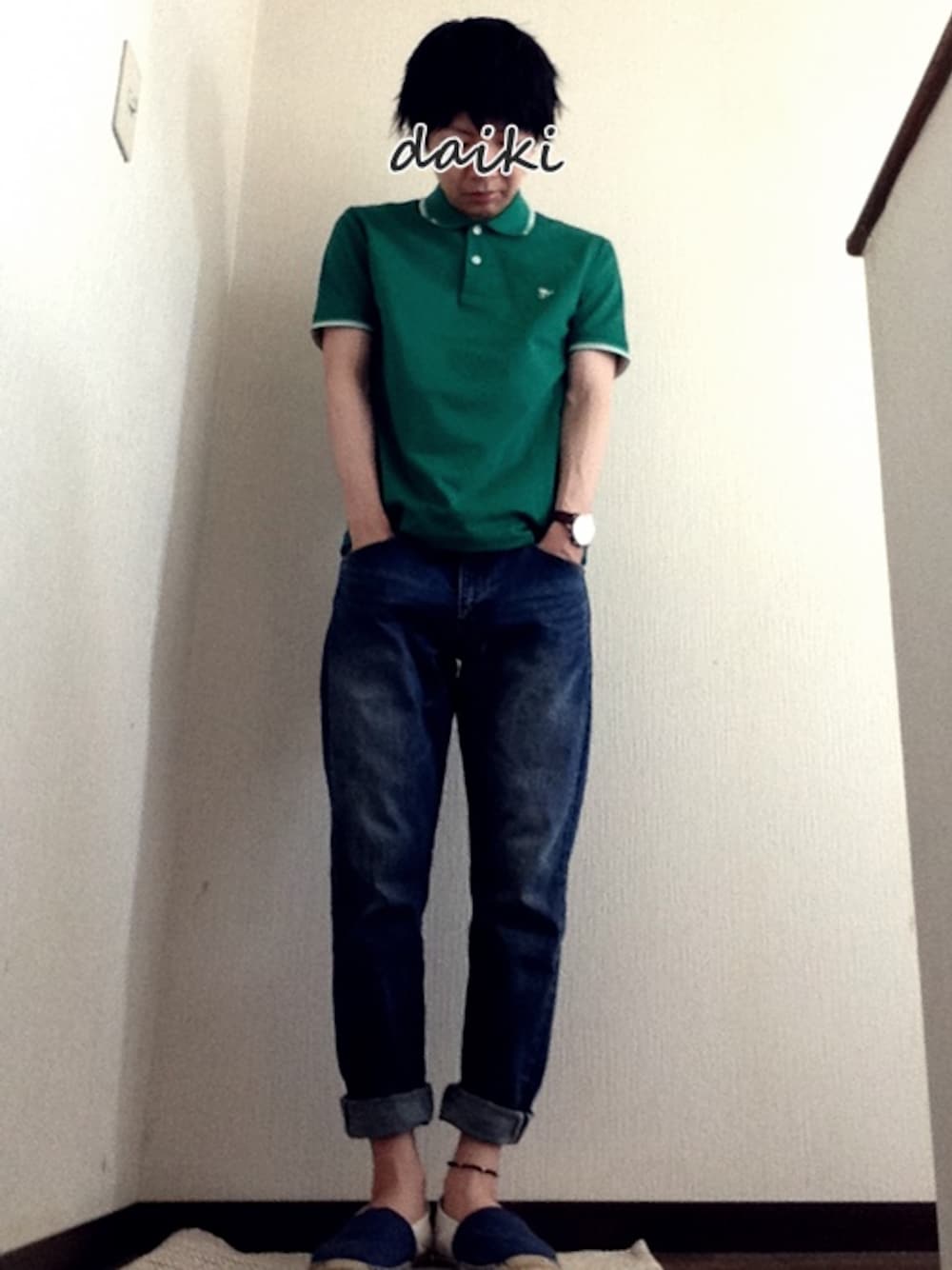 グリーンのポロシャツをメインにして、あとはネイビー系でまとめてみました。 ボタンは上まで閉めて、ラフになりすぎないように。