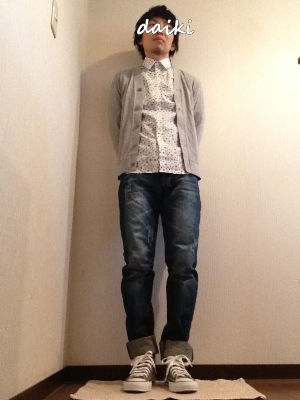 シンプルすぎたのでシャツは花柄でアクセントを。 カーディガンとスニーカーは両方グレーですが、濃淡でメリハリつけてます。