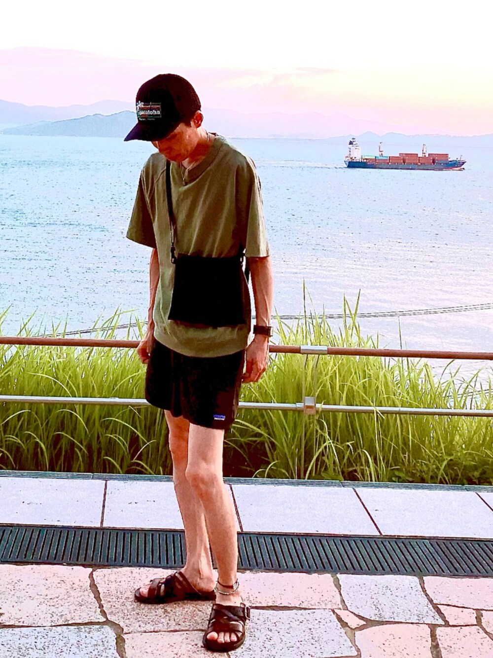 カーキとブラックは相性よっちゃん。 オーバーTに短パンにサンダル。 楽ちんコーデです。 ちょうど⛴が通過です。