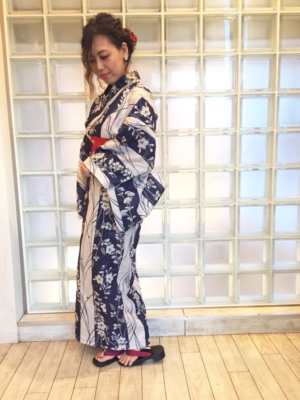 ブルー系の浴衣を着用したレディースの夏コーディネートの1枚目の写真