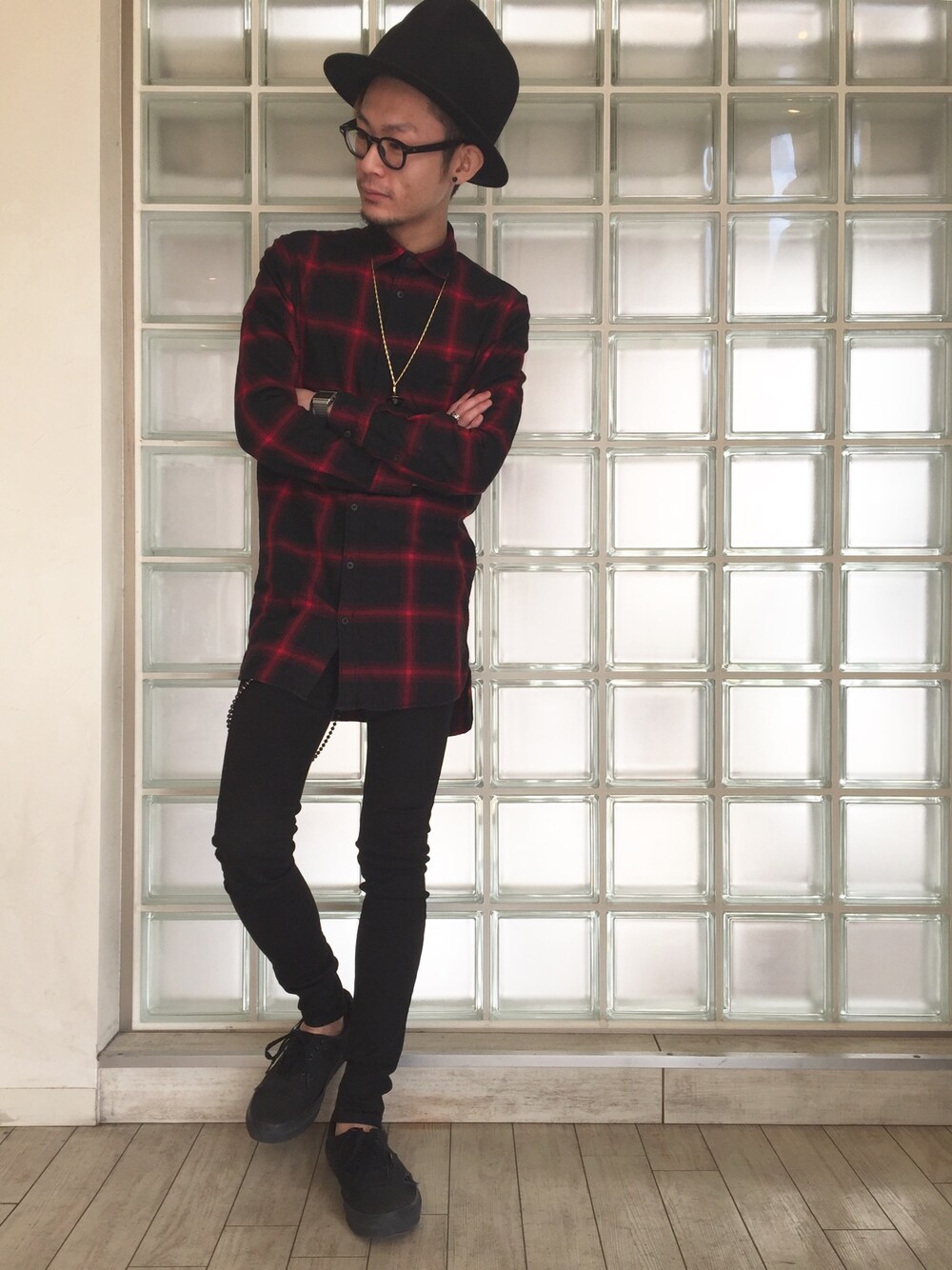 ブラック系のスニーカー、ブラック系のハットを着用したメンズの冬コーディネートの1枚目の写真