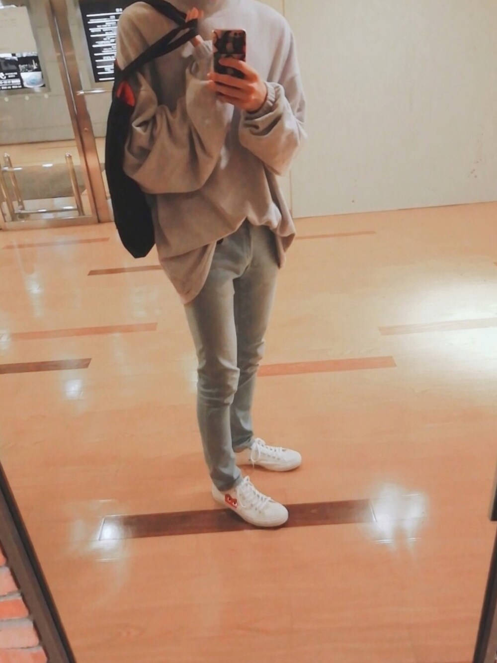 ちょっと肌寒い日にでも… グレーのダボっとしたシルエットがたまらない… 白トーンで全体をコーディネート!!