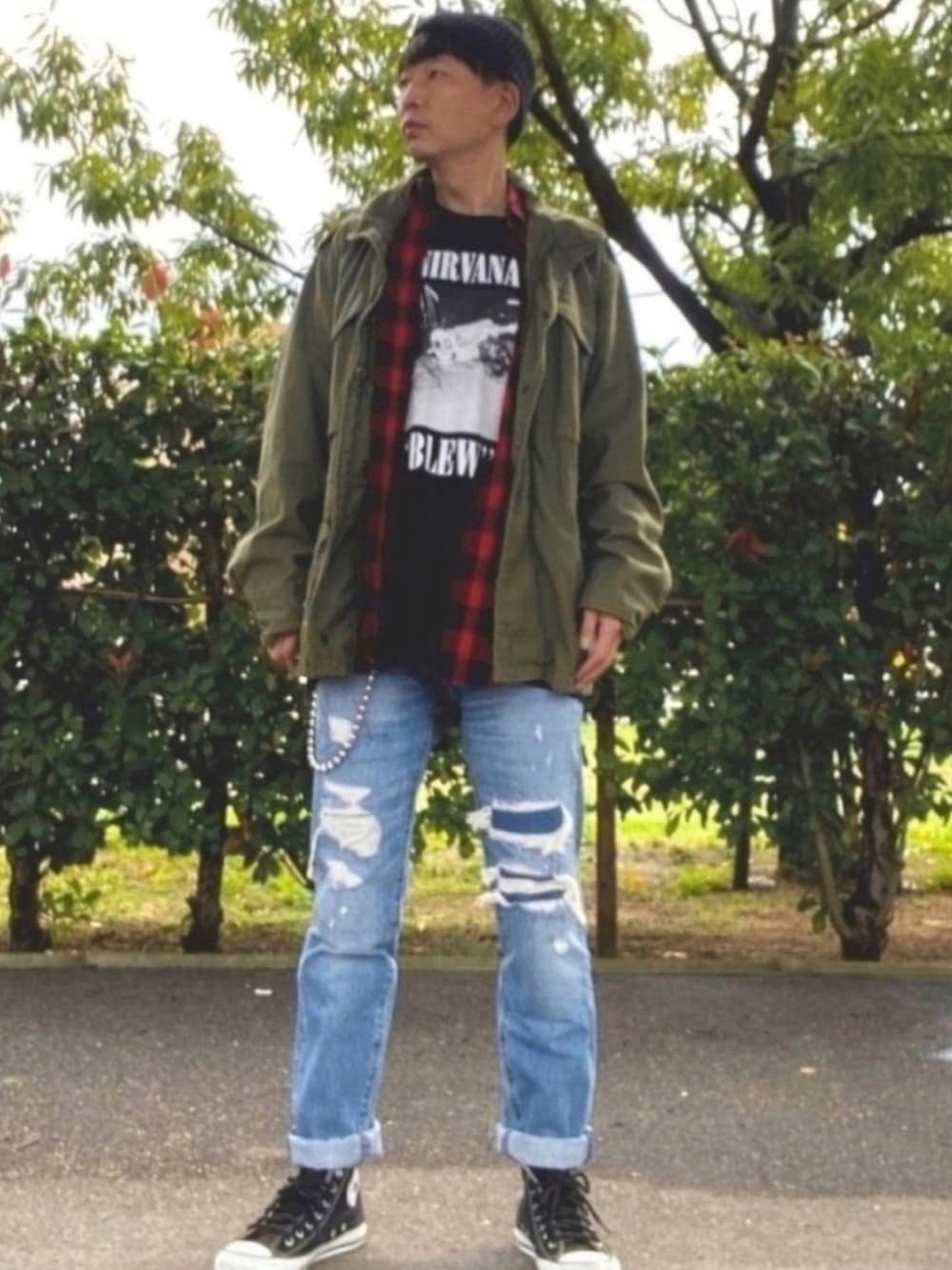 閲覧ありがとうございます‼️😆 古着で購入したM-65のショート丈の ミリタリーコートでグランジコーデです。 客観的に見て、ちょっとイナタイ感じ ですが…😂 このコーデのコートがない格好で 古着店さんに行って、店員さんに 「グランジで冬物のアウターって何が いいですかね〜⁉︎」 って相談して選んだのがこのコートでした。 試着でコートを着ていたら 店員さん3人から お褒めの言葉を頂きました! 最終的には僕含め4人で服や音楽の話で 盛り上がり、最後にお店のインスタ用の 写真まで撮って貰えました! めちゃめちゃ、楽しく嬉しかったです!😆 因みに、コートはアメリカ産🇺🇸です。 グランジのアウターにしようと思って たので、アメリカ産🇺🇸に拘りました。 先日、この格好で息子を保育園に 送って行ったら、女の子が寄って来て 「息子くん、皆んなで遊ぼ〜」 「昨日はブロックで遊んで楽しかったね〜」etc ずっと喋ってきたのですが、その間ずっと 僕の破れたジーンズの糸を指に絡めて話して ました😂 その後、先生が気付いて 「〇〇ちゃん、やめなさい!ズボンが 破れちゃうでしょ」って注意されていたのが 可笑しかったです😂 BGM(小窓) Mudhoney / Touch Me I'm Sick 個人的にはグランジの代表曲として TOP5圏内に必ず入っている曲です。 大学生の時にやってたコピーバンドでは よくコピーしていて、暴れ過ぎてよく 酸欠になってた思い出の曲です😂 Sonic Youthもカヴァーしていて そっちもクールな感じでカッコイイです。 プロフィール欄のPCのマーク🖥に YouTubeを貼ってます。