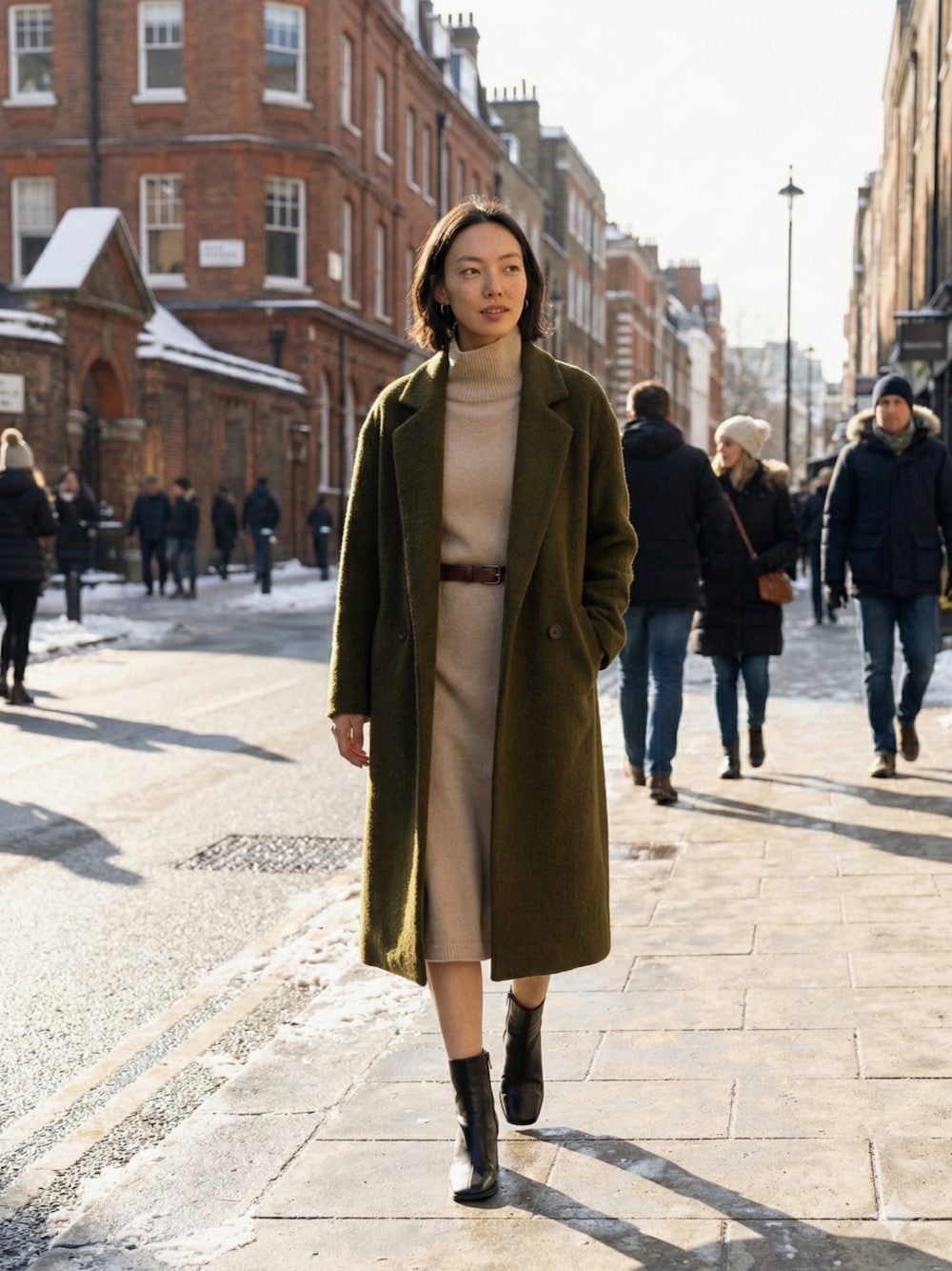 落ち着いたカーキのロングコートに、ベージュのニットワンピースを合わせた上品な冬コーデ。自然なシルエットと柔らかなカラーで、大人の余裕を感じるスタイルに仕上げました。