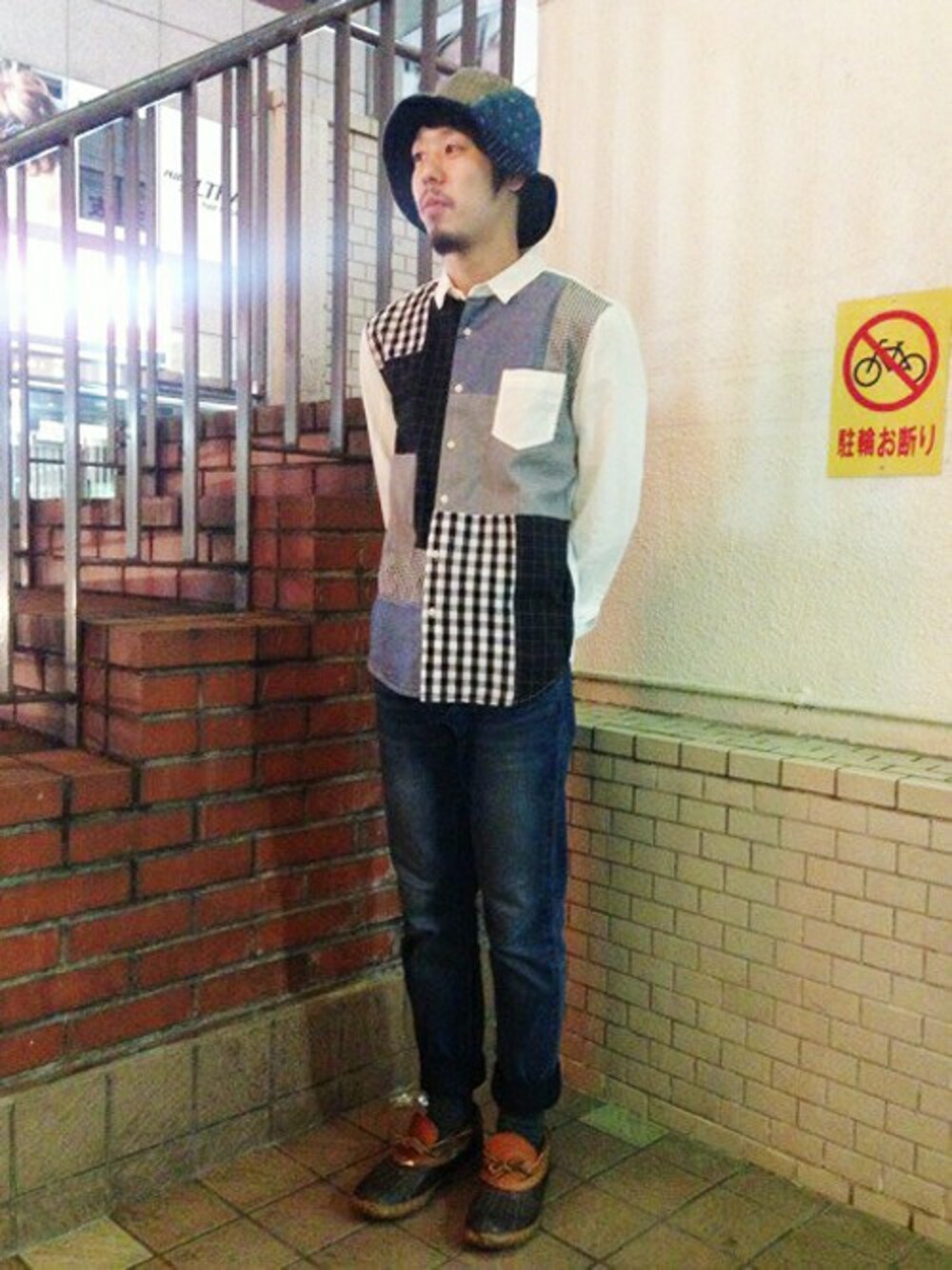 パッチワークのシャツは1枚で着用しても存在感のあるシャツです。 パッチワークのハットとデニムを合わせてコーディネートしました。