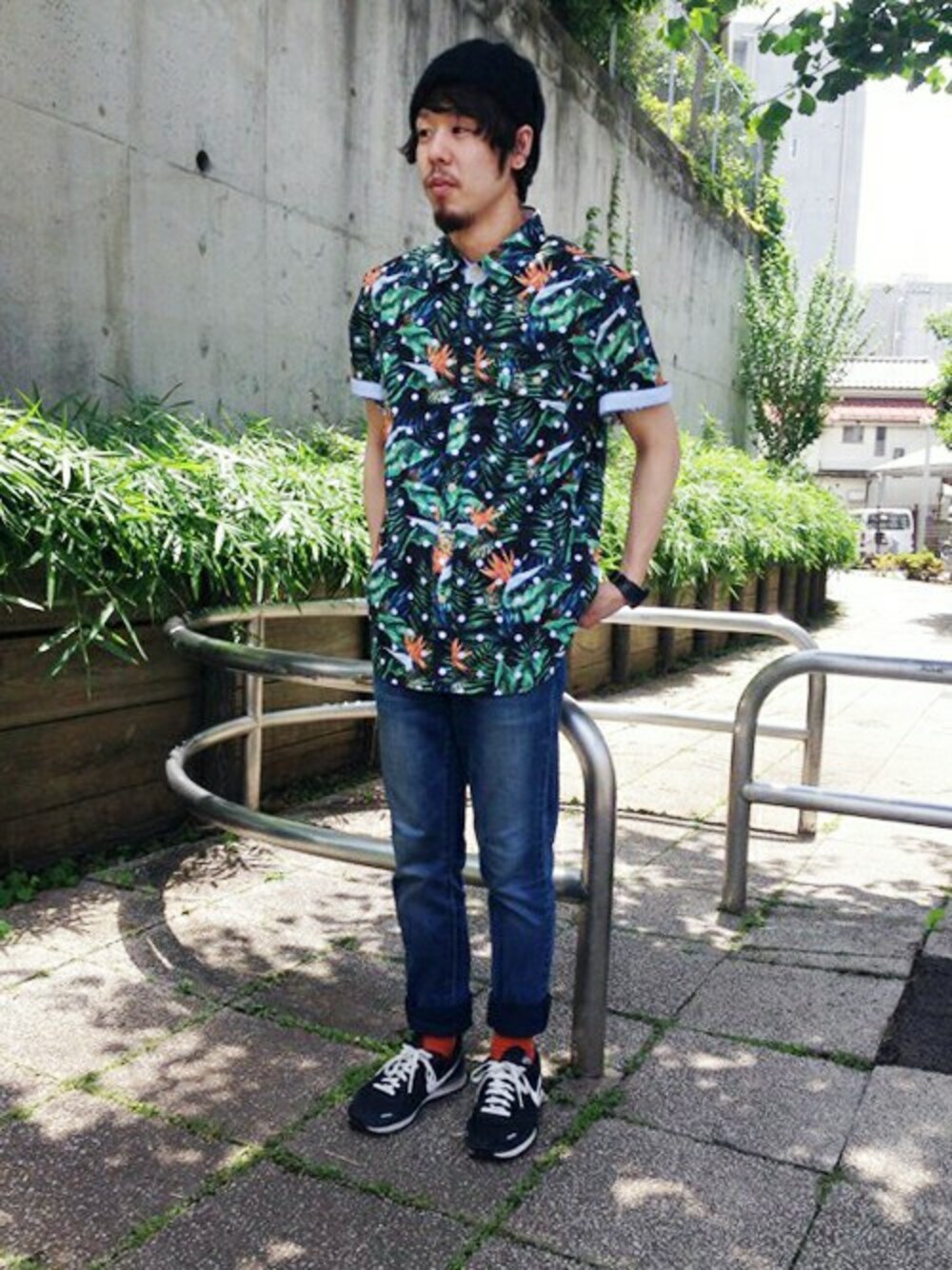 総柄のシャツなので、他は定番アイテムでコーディネートしました。