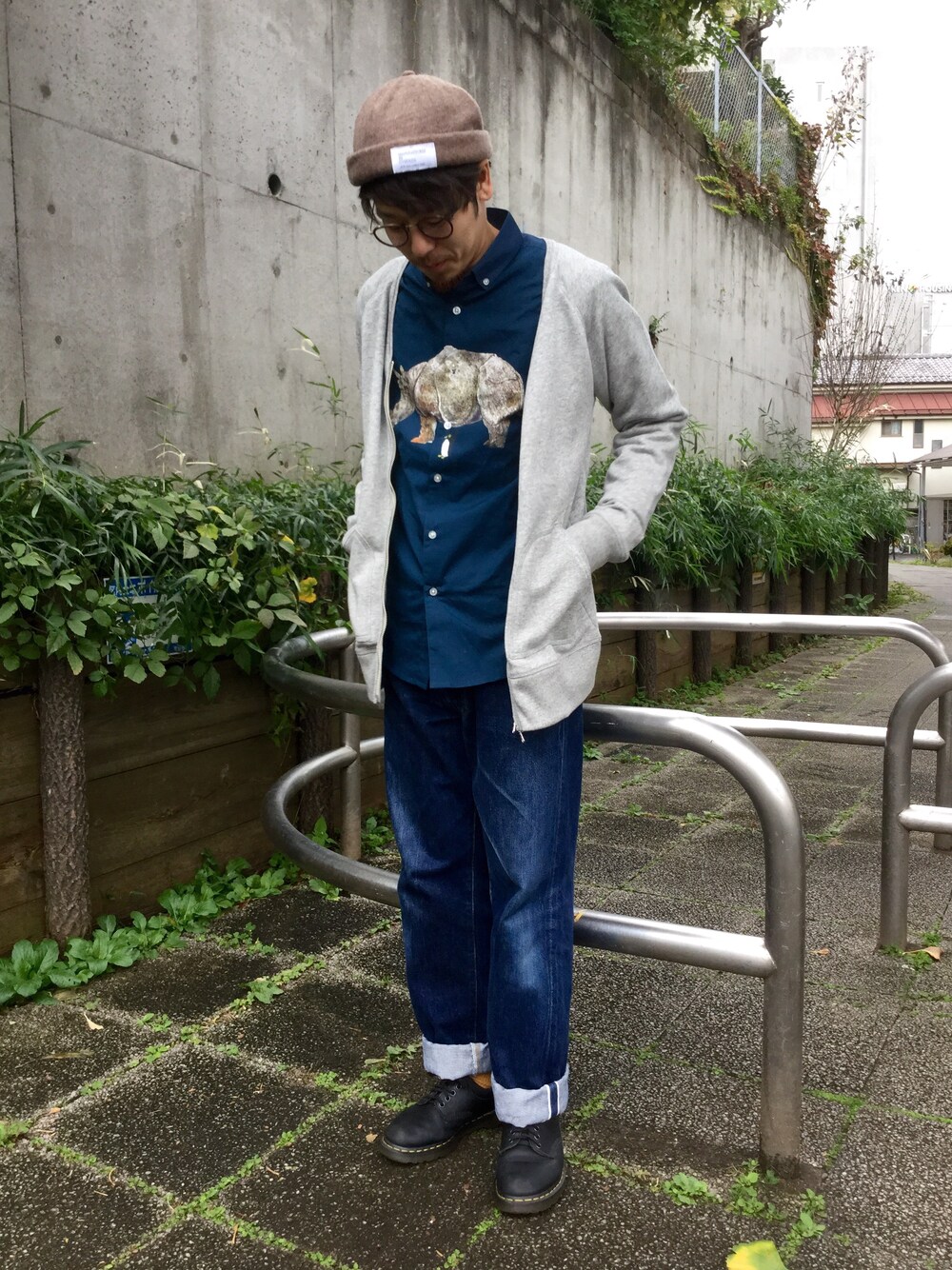 サイのデザインが際立つように同系色でまとめました。 羽織は形の珍しいジップカーディガンです。