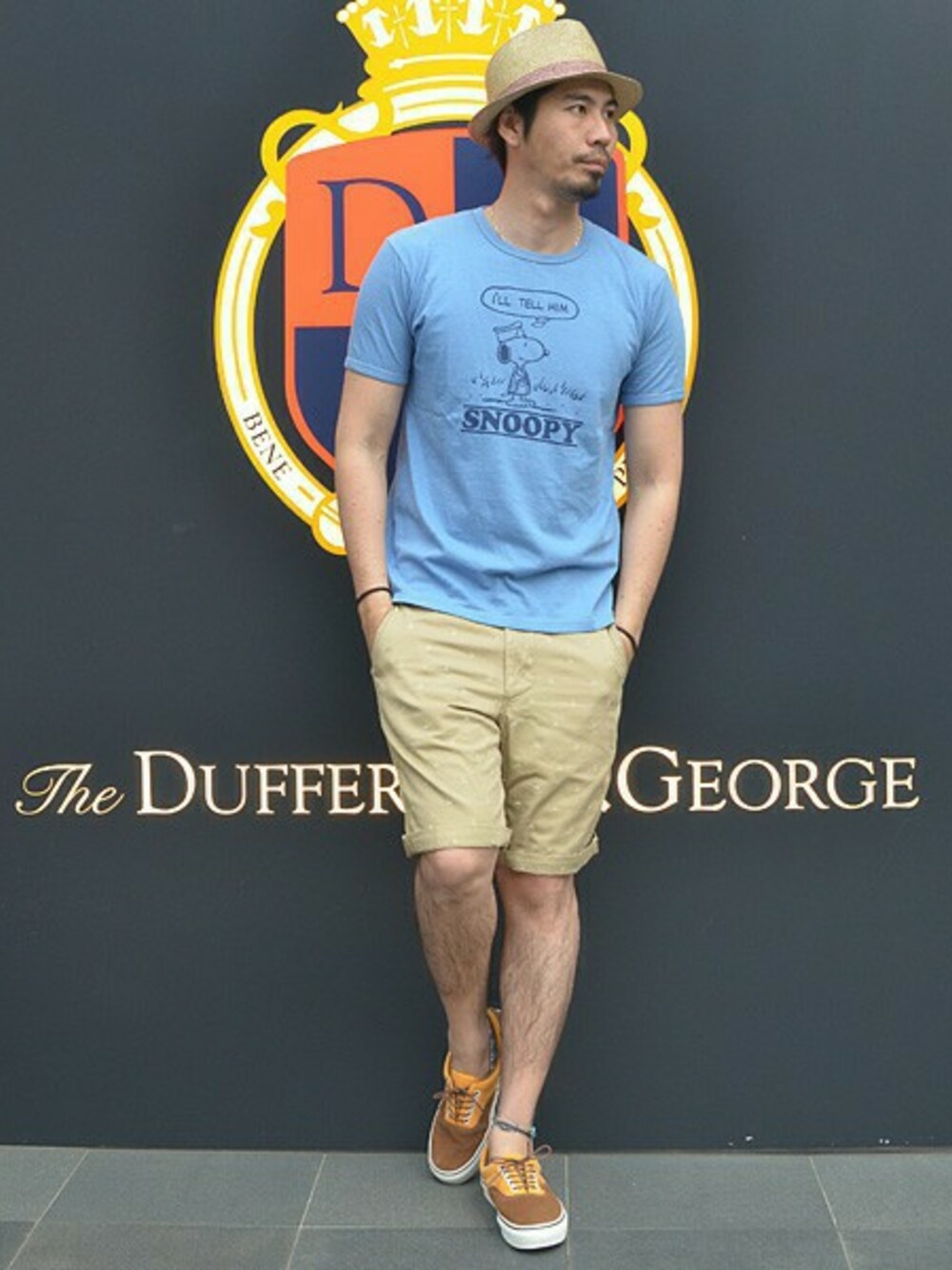夏のリゾートファッションを意識した コーディネート。スヌーピーTEEで "はずし"を演出。