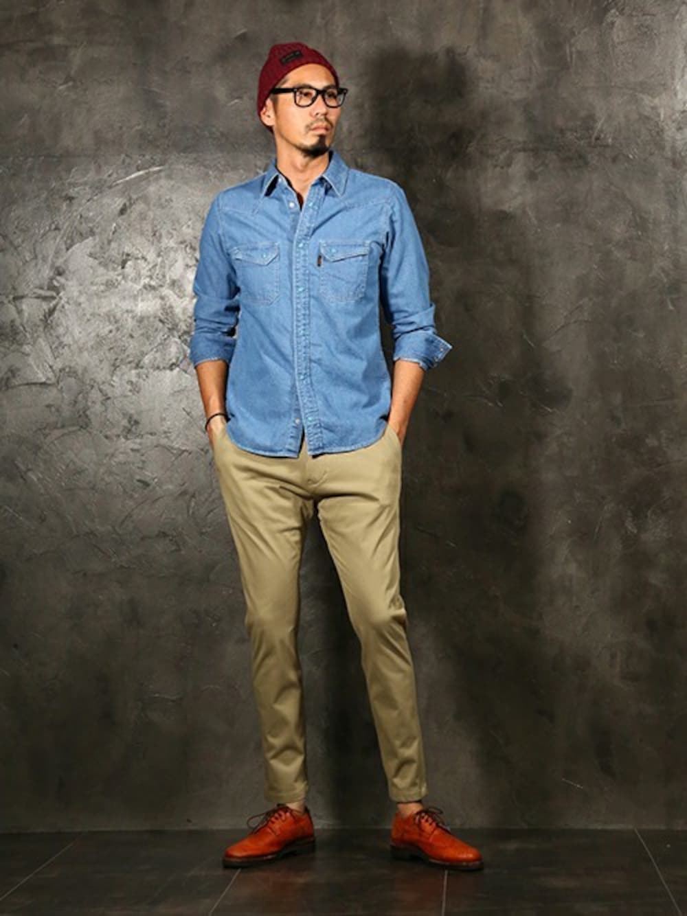 インディゴブルーとベージュの王道カラーの組み合わせ ですが、パンツのシルエットが全体を引き締めています。