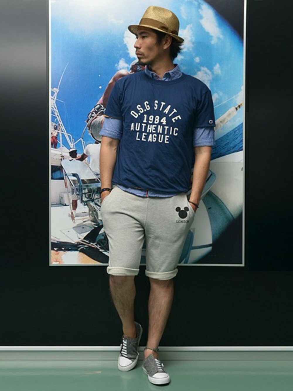 チャンピオン+MICKEYのキャッチーなアイテムを使った、王道アメカジコーデ。夏を意識した爽やかなスタイリングです。