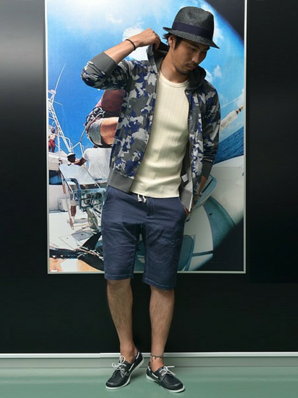 カラートーンを抑えたコーディネート。 パーカー×ショーツは抜群の相性です。 さらりと織ったカモ柄パーカーが印象的。