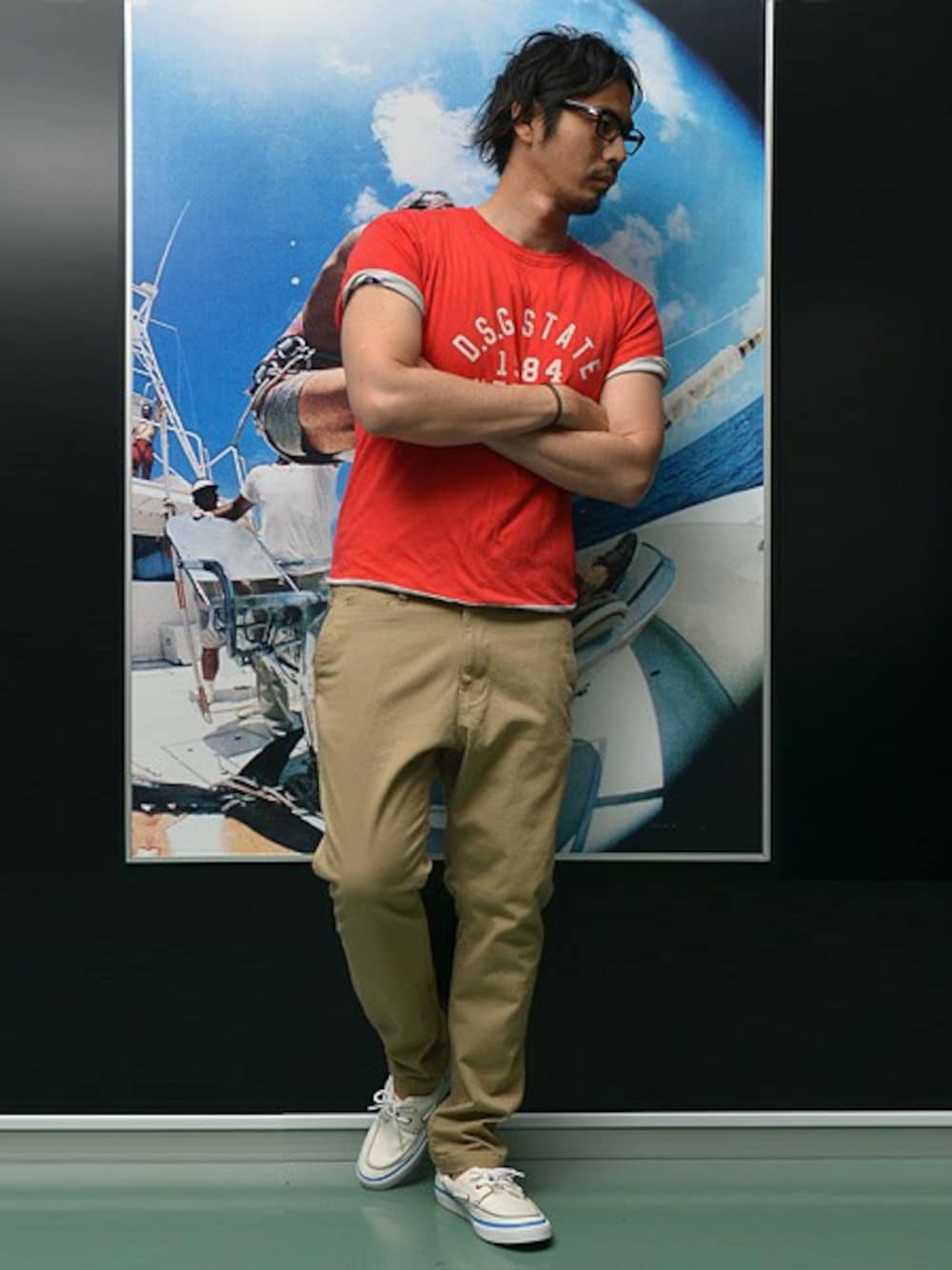 DUFFER一押しのスキニーテーパード パンツにチャンピオンのリバーシブルTEE をコーディネート。シンプルながらスタイリング のバランスが絶妙です。