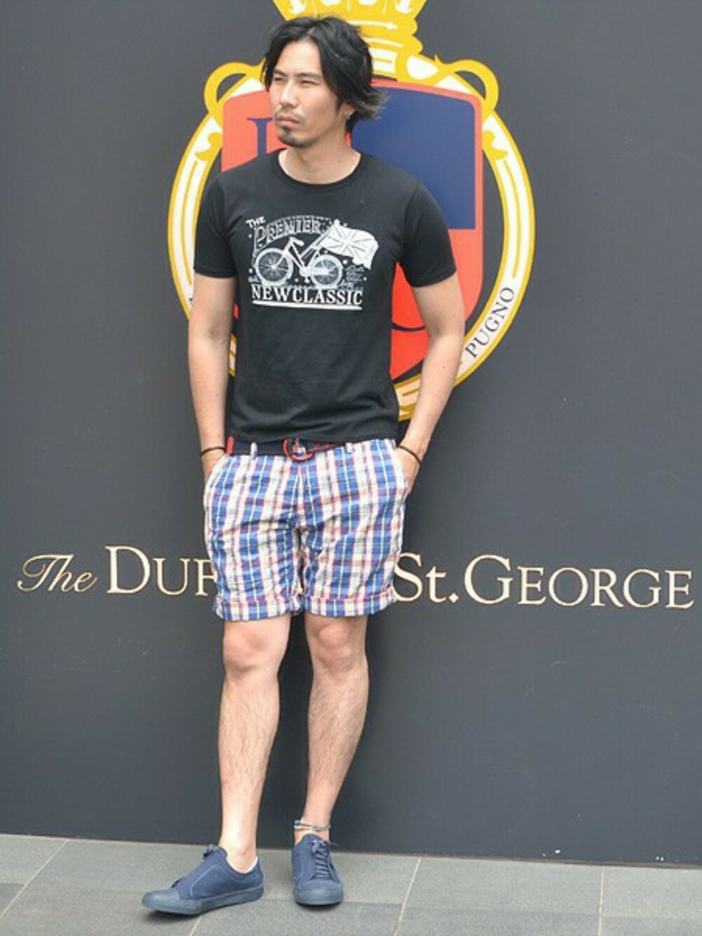 シックなTシャツにトレンドの柄パンを スタイリングしました。 シンプルになりがちなショーツスタイルに 柄を加え、アクセントにしています。