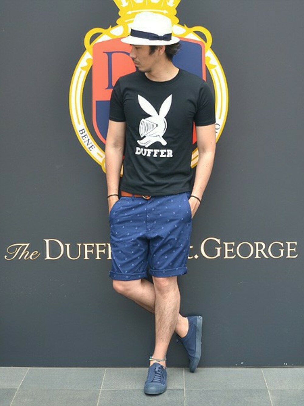 今年の夏はリラックスムードのショーツ スタイルがお勧め。 男らしいブラックのTシャツに、ホワイト のハットを差し色にスタイリングしました。