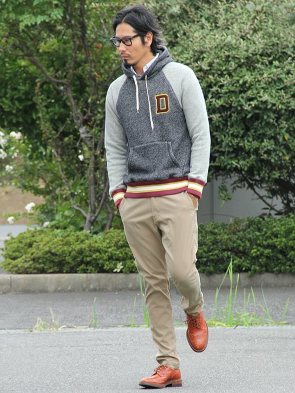 カラーリングがDUFFERらしい チャンピオンコラボのパーカー。 シンプルにベージュのパンツで。