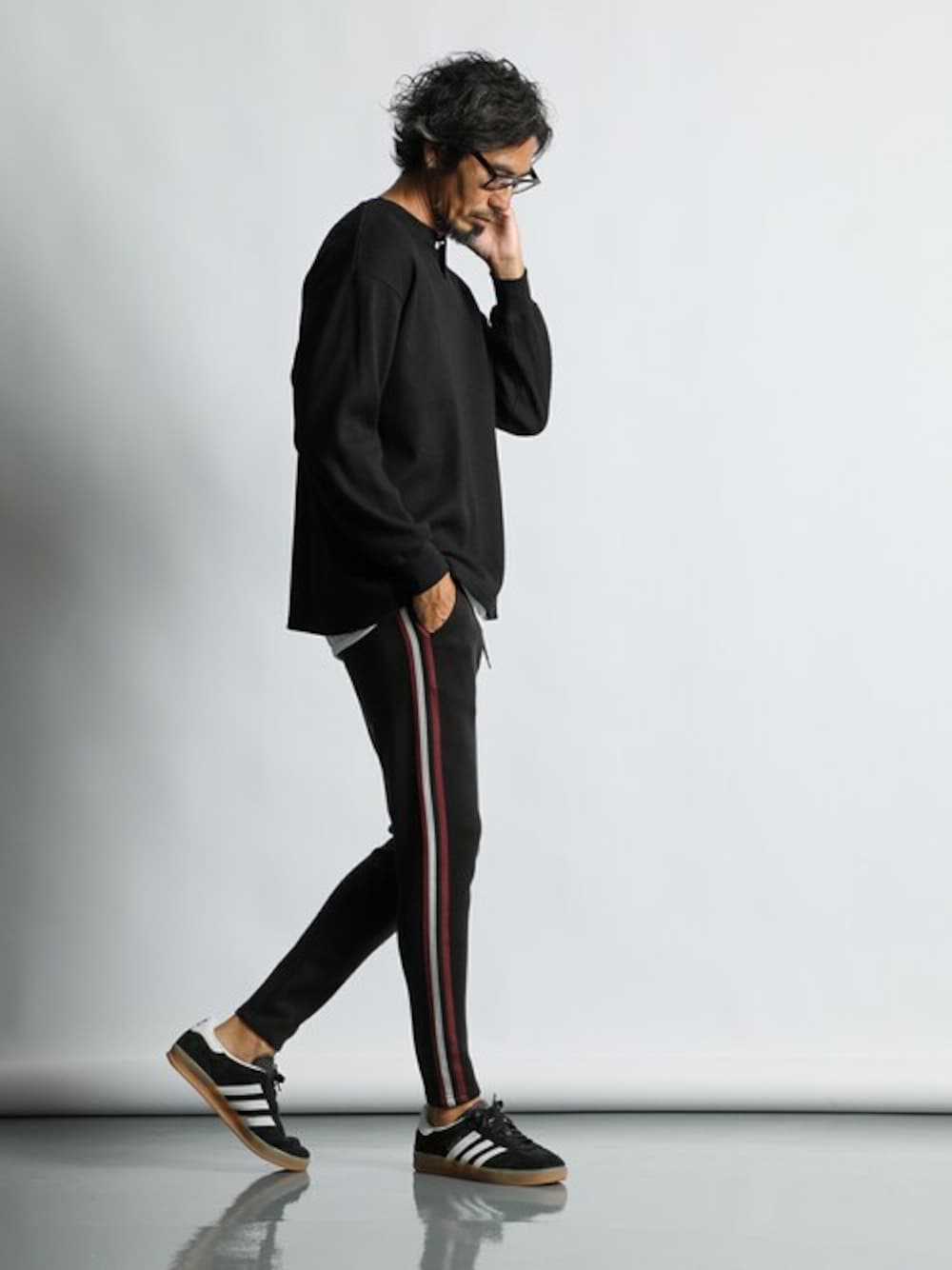 ブラックのワントーンコーデ ブラックカラーでまとめつつ、ボトムスのサイドラインが程良く効いたシンプルコーデ。