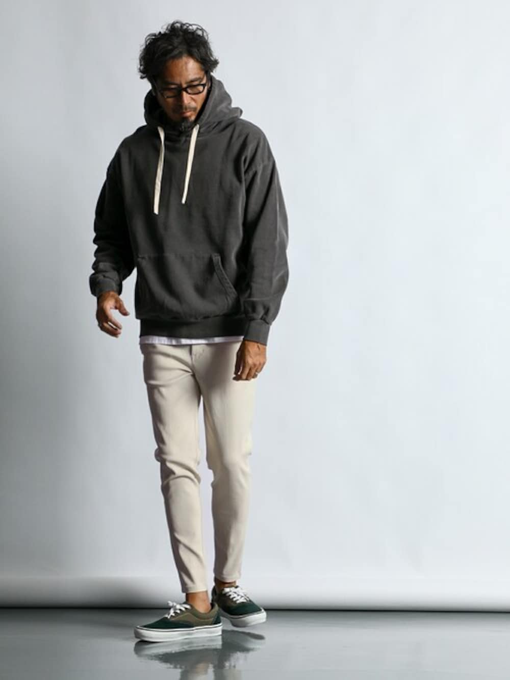 大人のパーカースタイル すっきりとバランスのとれた秋のパーカースタイル。ルーズなトップスとタイトなボトムスの相性が抜群。