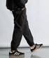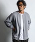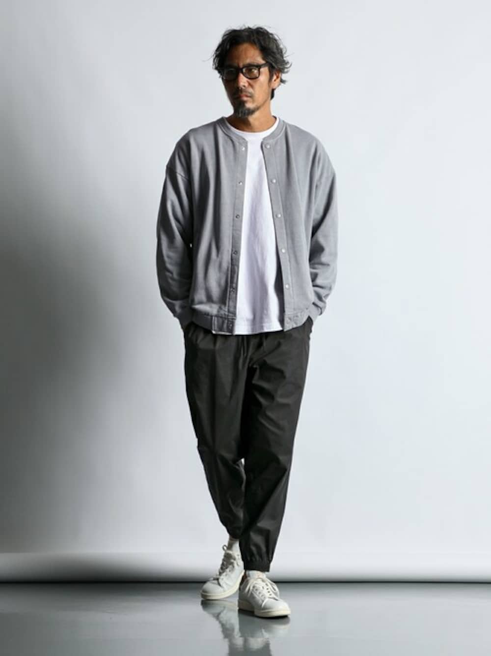 アクティブなレイヤードスタイル スウェットカーデとナイロンパンツでアクティブな印象に。