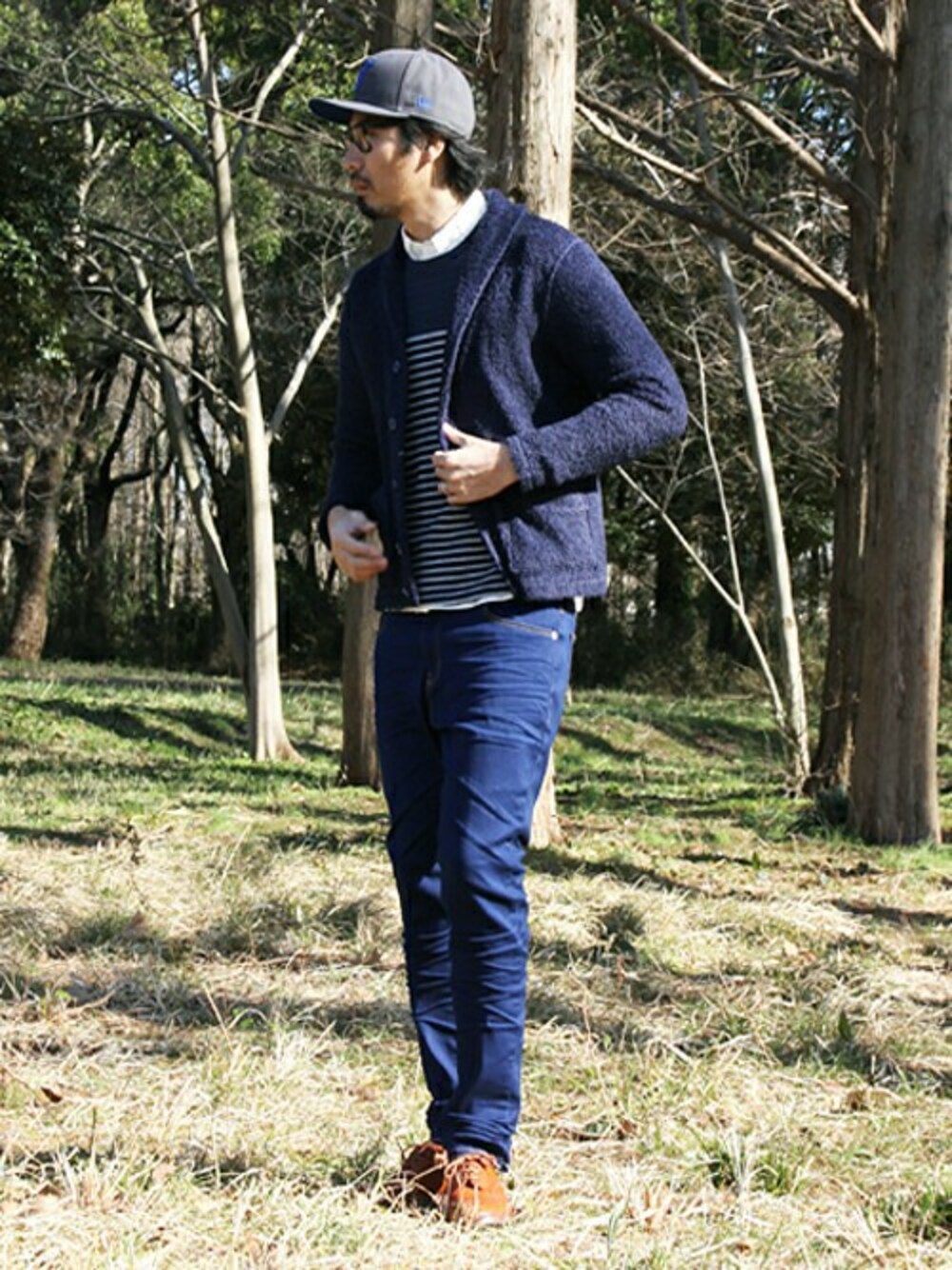 インディゴブルーで統一した ワントーンコーデ。 ボーダーやカーディガンの素材 をアクセントに。
