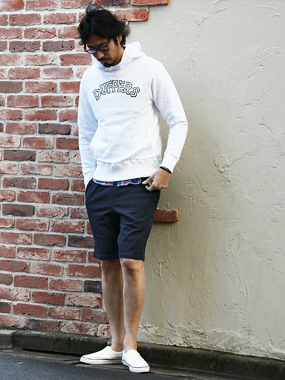 DUFFERらしいスウェットアイテム を使ったコーデ。 インナーのシャツを少し覗かせて、 アクセントに。