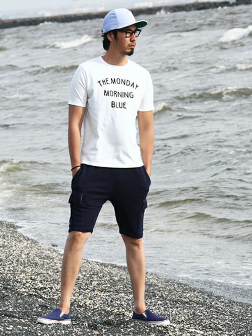 白×ネイビーのシンプルコーデ。 キャップでアクセント。 ショーツはすっきりめなシルエット をチョイス。