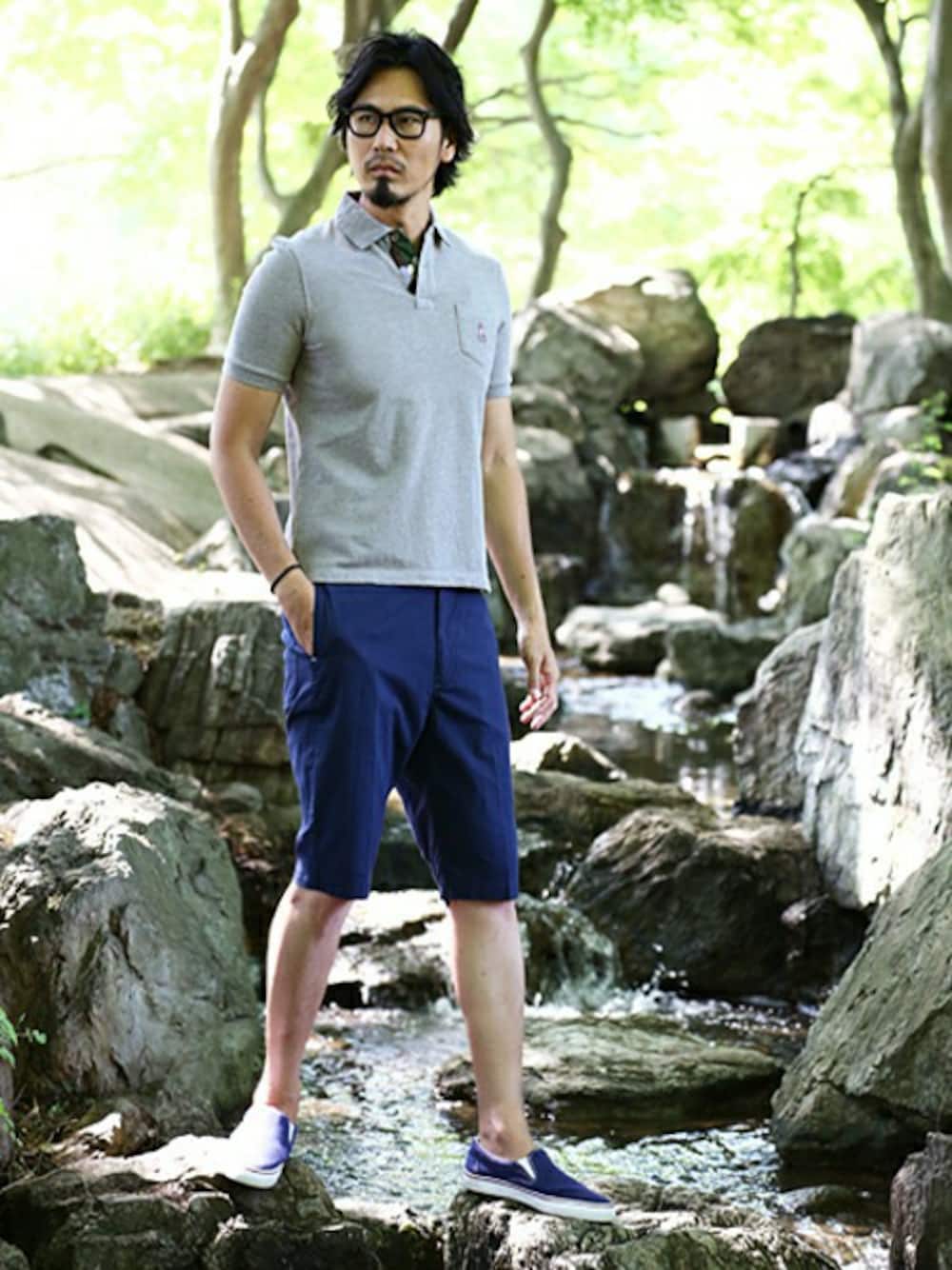 綺麗目な印象のサイコバニーポロをショーツ でカジュアルダウン。 ショーツはあえて長めの丈をチョイス。
