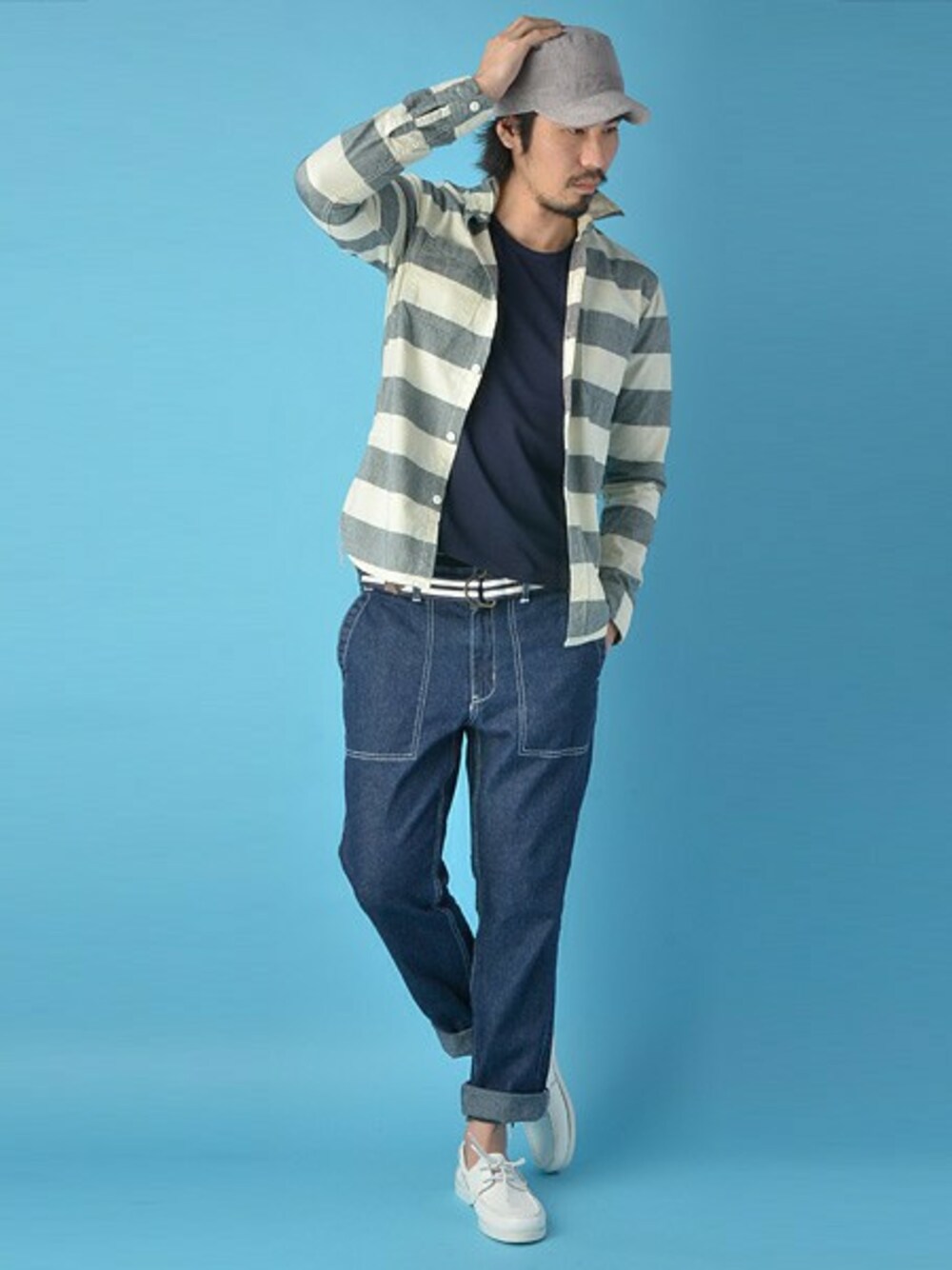 使い込む程に味のある風合いになる、ボーダーシャツに、ベイカーパンツとスウェットキャップで、リラックスしたワークカジュアルを。
