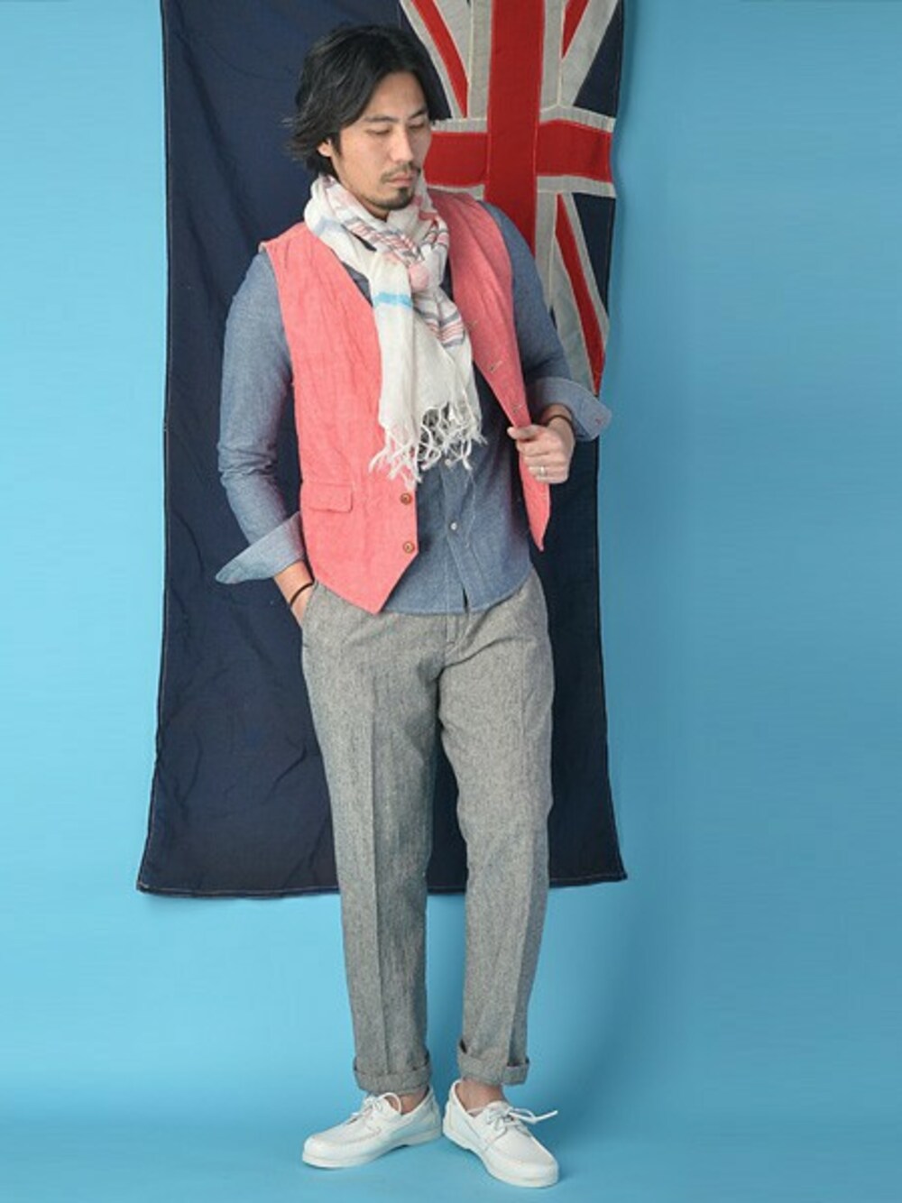 プレッピーテイストには、麻素材を取り入れたアイテムで、大人綺麗目のスタイルを演出。ロールアップしたクラシックなスラックス、爽やかでいてふんわり感のある胸元、旬のピンクのベストで、季節感にあわせたスマートカジュアルがポイントです。