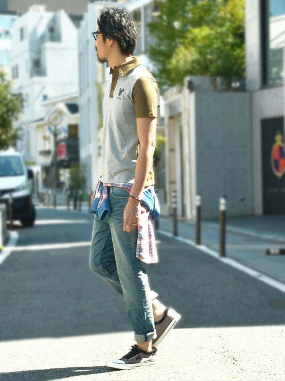 ミッキーポロをメインに、アメカジスタイル で大人カジュアルに。 腰に巻いた赤系のシャツがポイント。