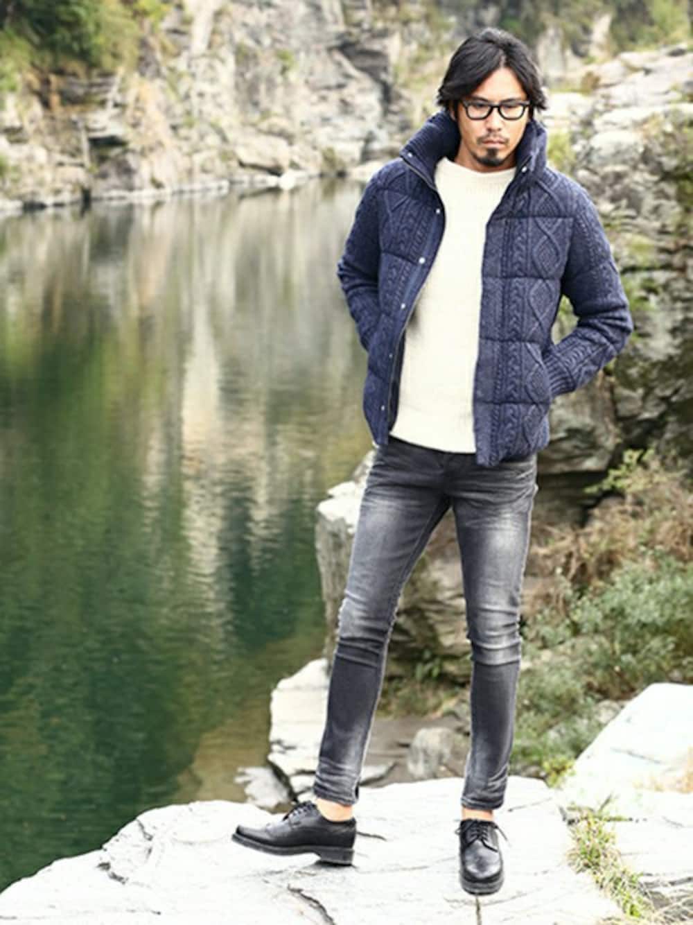 今シーズンDUFFER一押しアウターの ケーブルニットダウンを使ったコーデ。 インナーにホワイトを合わせ、ネイビー のアウターをより大人っぽく仕上げました。