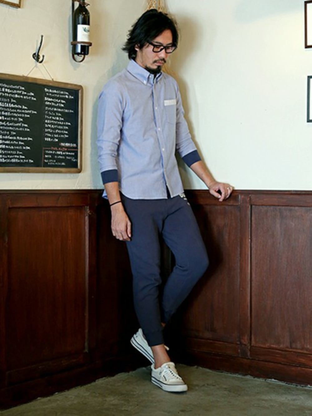 オックスシャツをあえてスポーティーに スウェットパンツで合わせました。 ラフな着こなしながら、パンツは細身で すっきりと見えます。