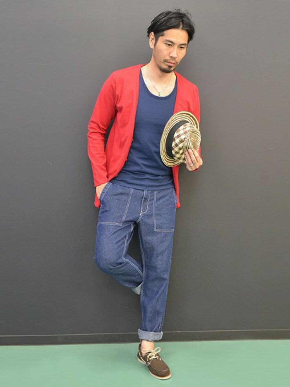 色鮮やかなロングカーディが春らしい スタイリング。インナーはあくまでシン プルにコーディネート。ボトムのロール アップや、ハットでアクセントを付けて います。