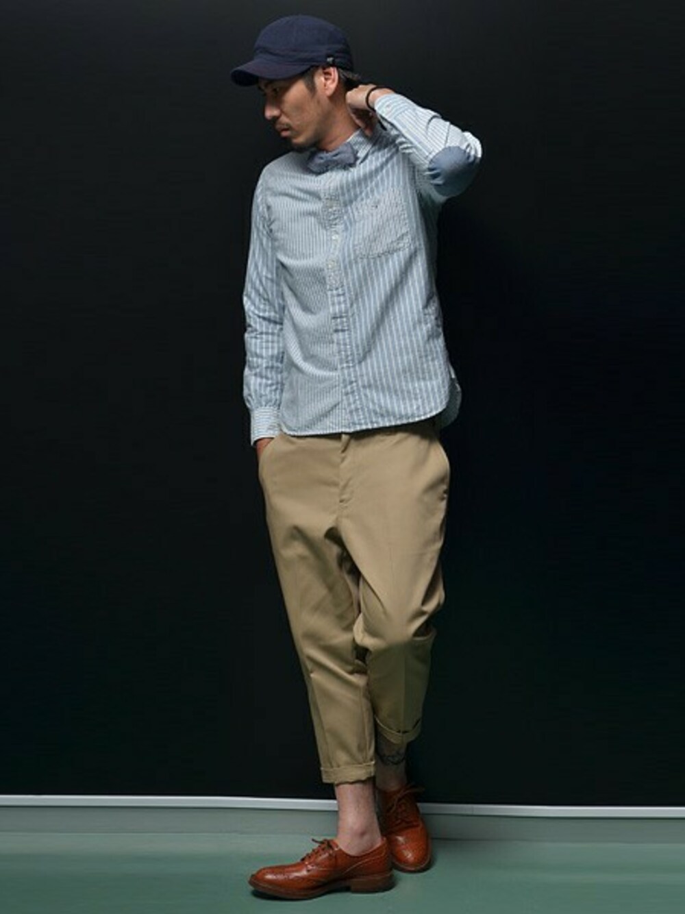 スマートなトップスにディッキーズを 合わせたコーディネート。全体の バランスが絶妙なスタイル。