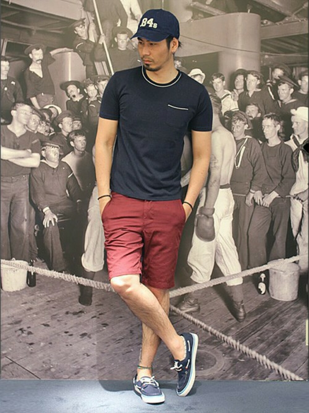 DUFFERのアイコンカラーであるネイビー×レッド を基調としたスタイリング。 トレンドのB.BキャップをMIX。