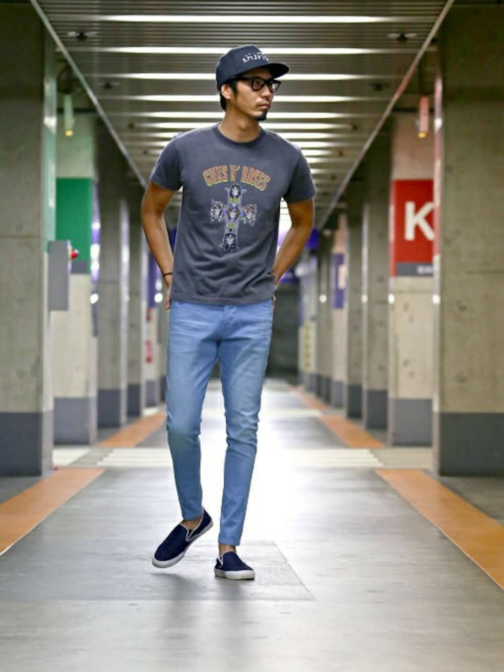 ハードになりがちなロックTをニュアンスカラー のボトムスをコーデしスタイリング。 スキニーラインでさらにクリーンに。