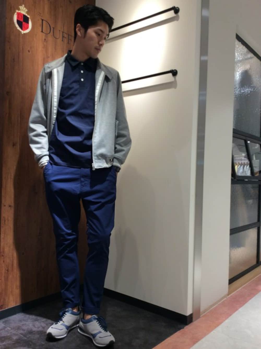 ネイビー×グレーの二色コーデ 一見シンプルですが、 インナーのポロシャツは生地の切り替えがさりげないので アウターを脱いでもお洒落です!!