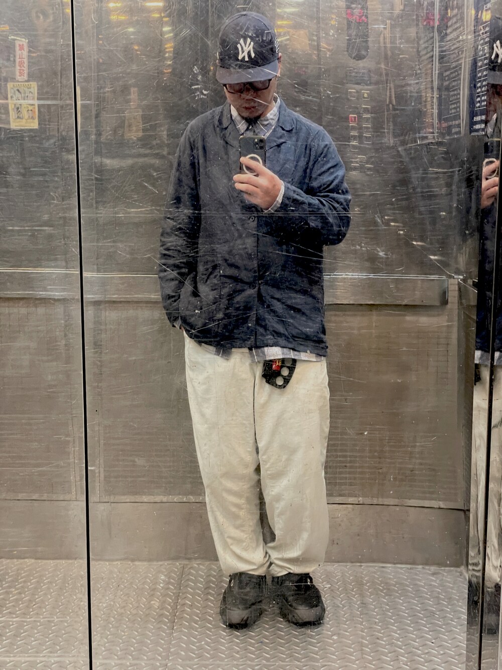 Cap/ New Era X ericemanuel Outer/ MUJI labo Top/ Demarcolab Bottom/ Demarcolab Shoes/ Braindead X Oakley