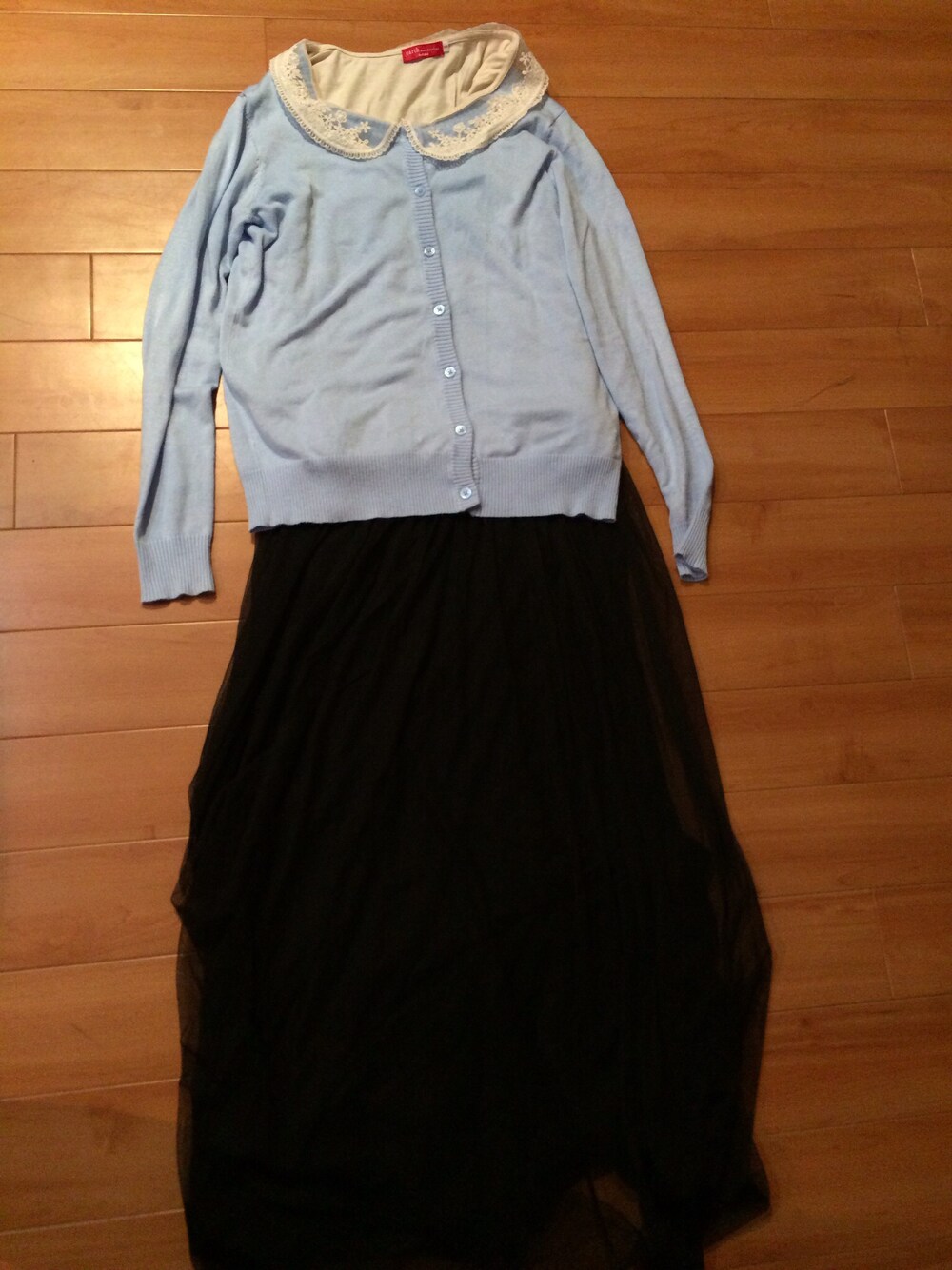 カーディガンのボタンをしめて、インナーの襟を出してみました☆ マキシ丈のチュールスカートと合わせて春っぽく♪