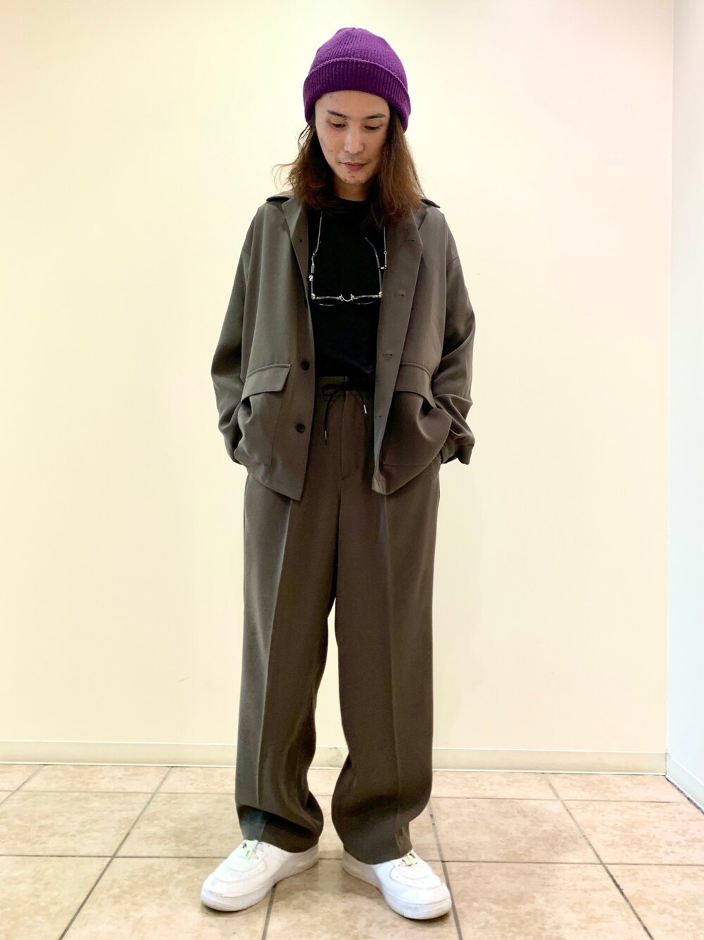 カーキのセットアップコーディネート! さらっとした生地感+ゆるめのシルエットで重たく見えないのがポイントです。 足元はスニーカーでカジュアルにするのがおすすめです!