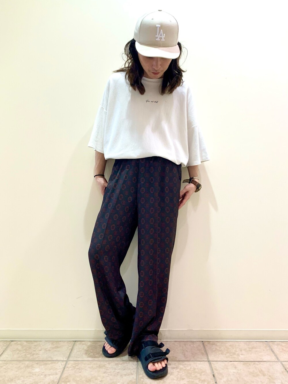 柄パンツ×シンプルTシャツ×サンダル 柄のサテン生地のパンツを主役に、Tシャツのカラーもホワイトで落ち着いた印象に。 またタックインをすることで足が綺麗にみえるのでおすすめです!