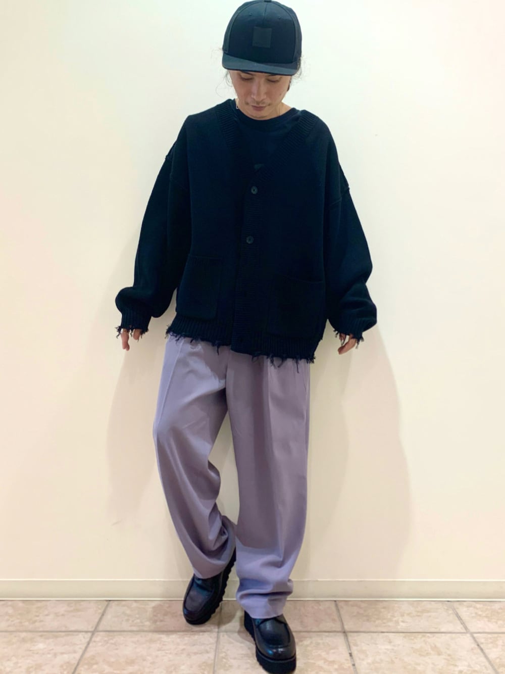 ダメージカーディガン×くすみカラーワイドパンツ◎ トップスは、ダメージ加工が施されているカーディガンのブラックカラー パンツは今季トレンドのくすみカラーのワイドパンツを履きカジュアルな印象に シューズはスニーカーより軽量なシンセティックレザーシューズを合わせてキレイめに! 厚底なので身長も盛れます!!