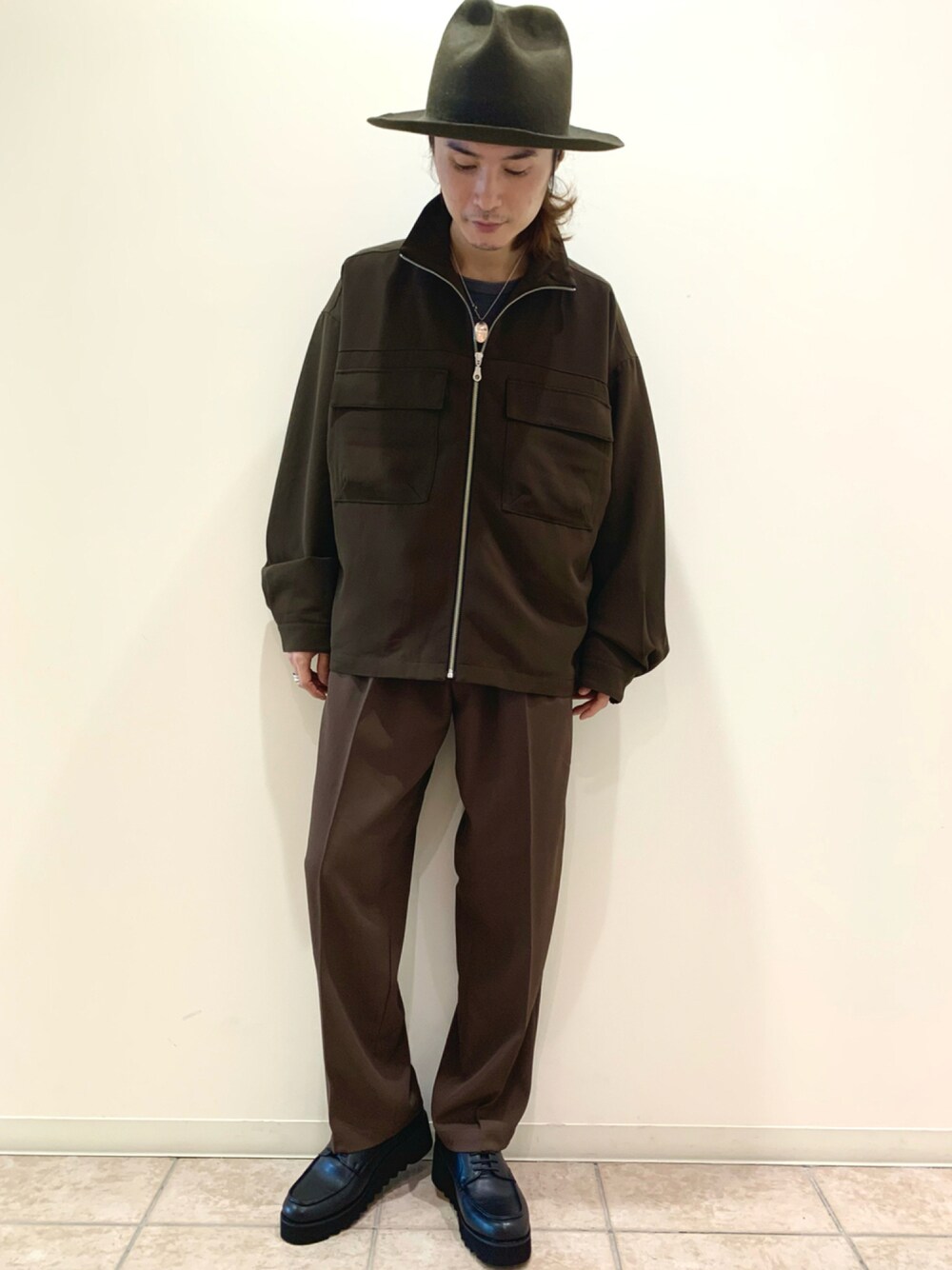 カーキ×ブラウン 秋カラーの『カーキ』のスタンドブルゾンに、ボトムは『ダークブラウン』のワイドパンツを合わせたコーディネート◎ 全体的なトーンを暗くしているのでカジュアルになりすぎないようにしています!