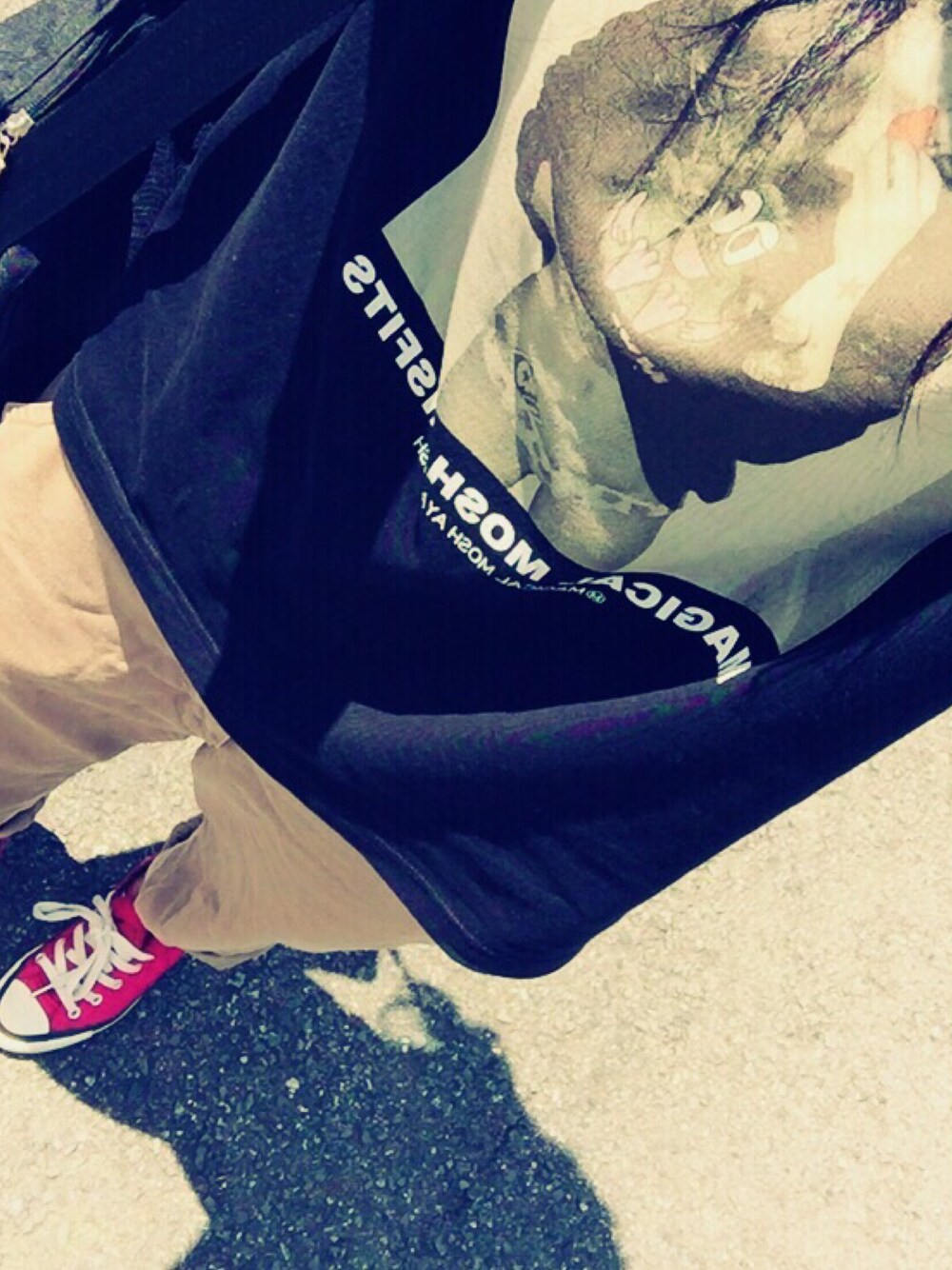 mxmxmとAYAMOちゃんのコラボTシャツ DickiesとDisneyのコラボパンツ mxmxmとFYDELITYのコラボスピーカーバッグ Converseはキルティング生地のスニーカー