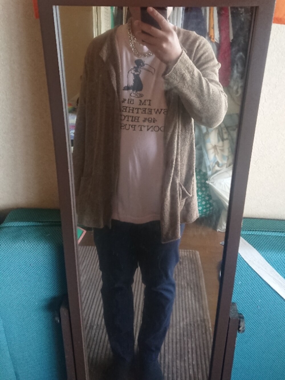 おとなしめなコーデなので、ネックレスとシューズでやんちゃにしました。