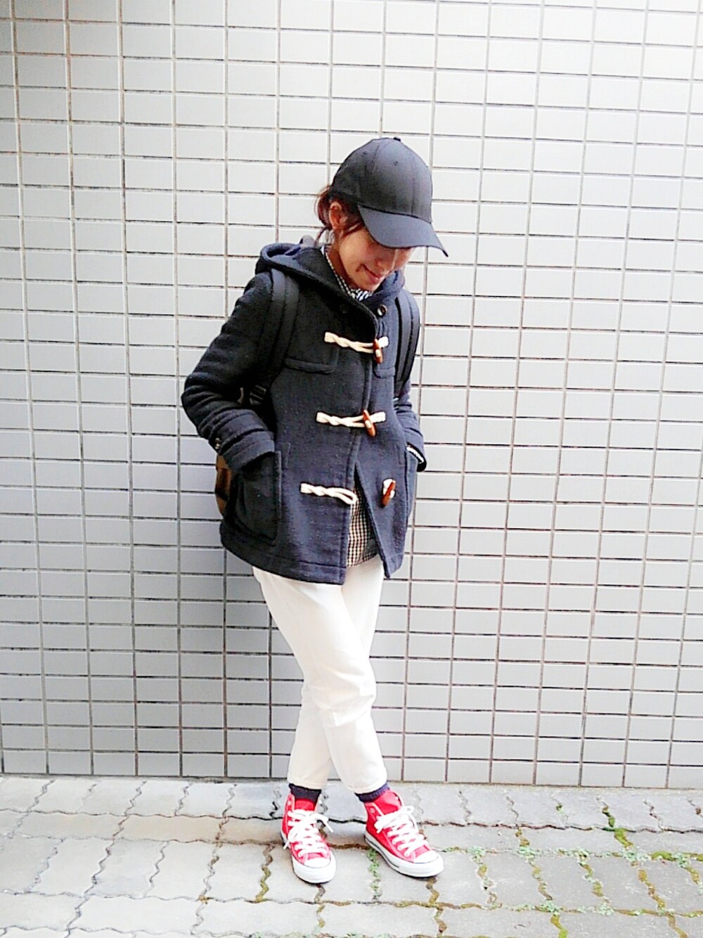 来てくださって ありがとうございます(^-^) とことんボーイズライク👦 をダッフルのネイビーとスニーカーの赤で トリコロール合わせに ⭐ 一番下のトグルが開いてるのはギンガムチェックを 見せたくて♪