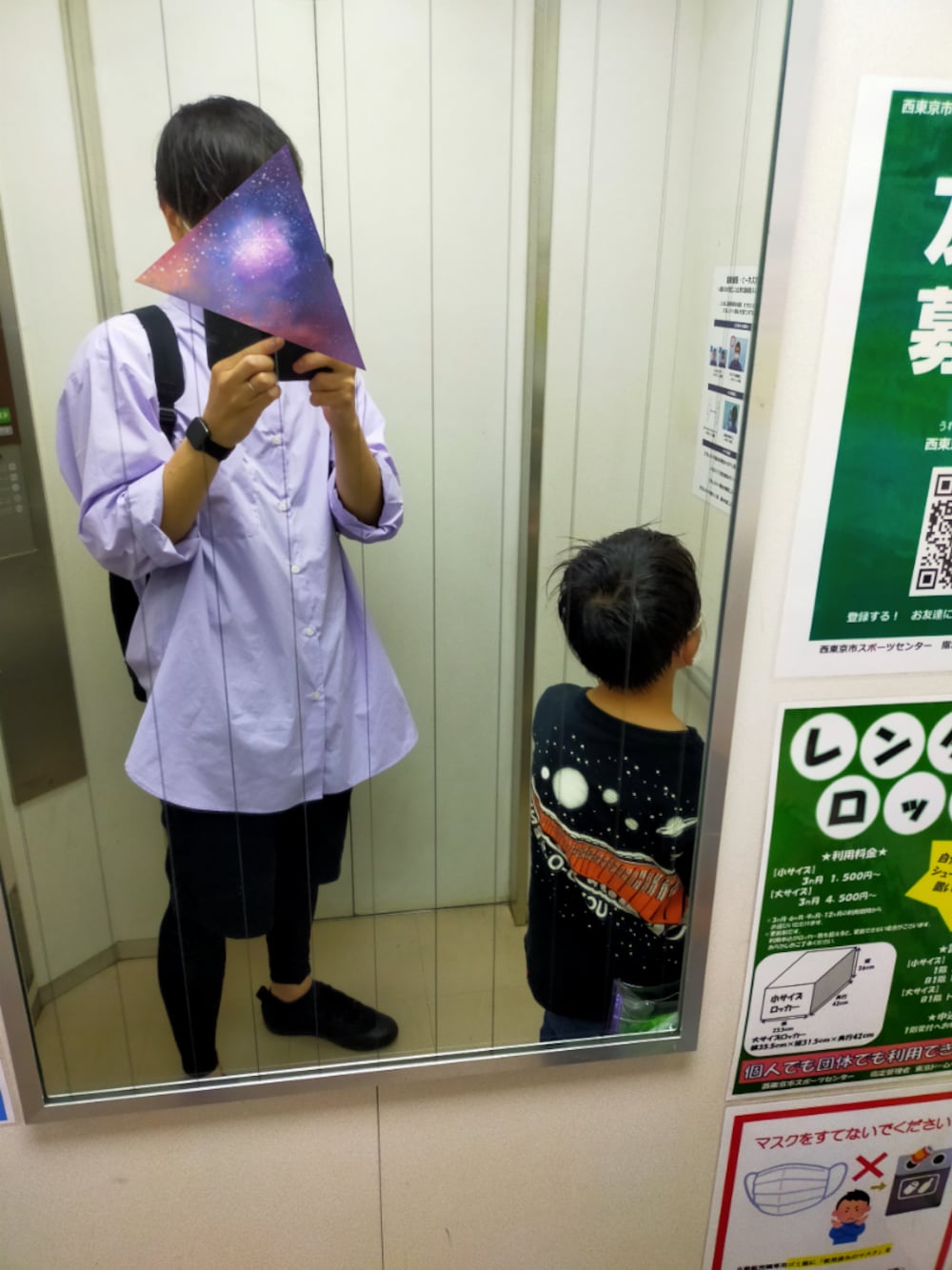 パープルのブロードシャツかなりオーバーで。ワンピースぐらいの丈感で、ドレープ感を増しています。 派手な色味の面積が広いので、ブラックで2トーンでまとめました。 二人ともプールでヘトヘト。。💦