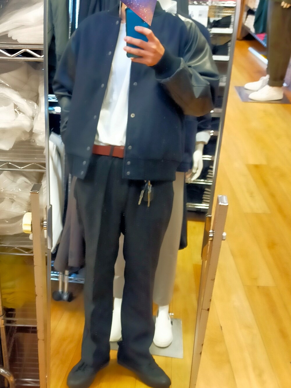 UNIQLO スタジアムジャンパーXL試着 シンプルで、スッキリ着やすいけど もうワンサイズ上げでもいい感じかと。 スラックス系に合わせたい気分。