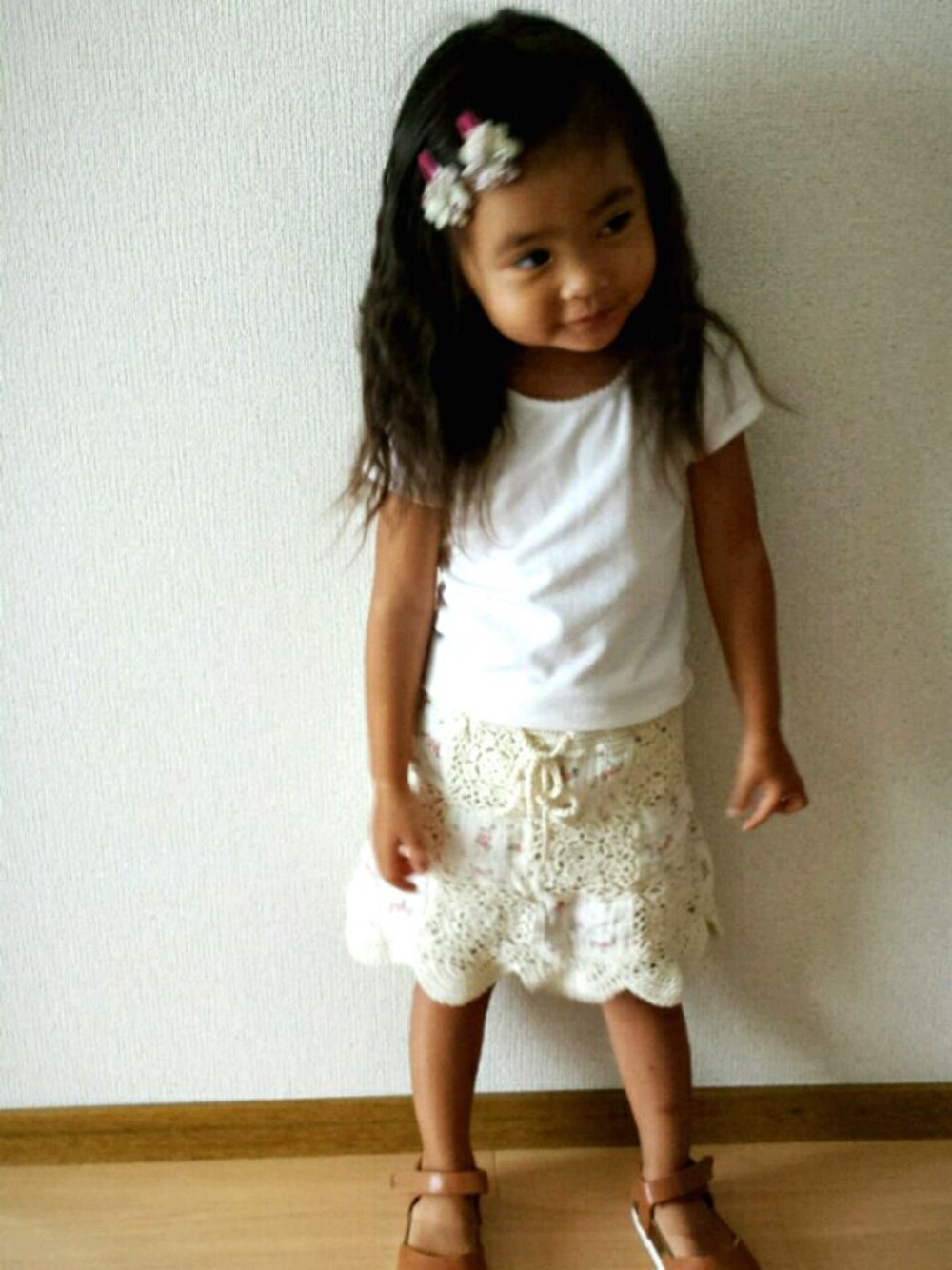 今日はちょっと風邪気味で機嫌悪いので、ビンボーパーマにかぎ編みスカートでレディーに☺